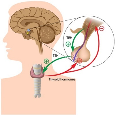 The hypothalamus produces TSH Releasing Hormone (TRH) that signals the pituitary to tell the thyroid gland to produce more or less of T3 and T4 by either increasing or decreasing the release of a hormone called thyroid stimulating hormone (TSH).