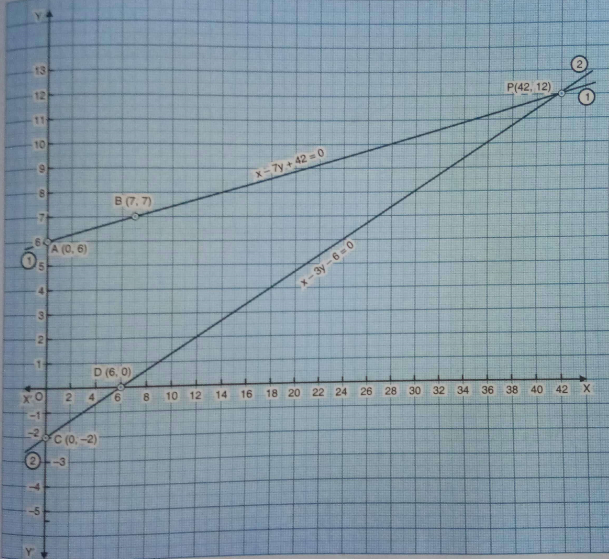 We observe from the graph that the two lines representing the two equations are intersecting at the point P(42, 12).