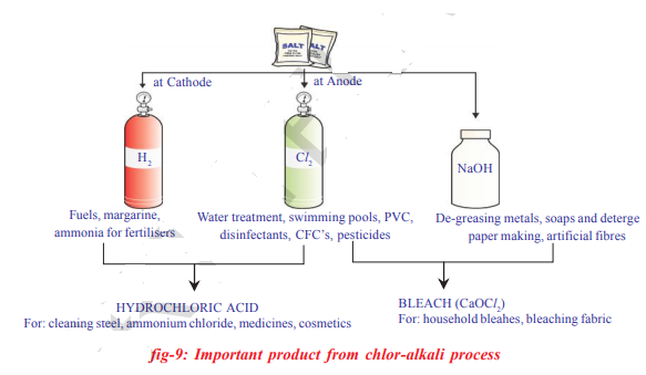 The common salt is an important raw material for various materials of daily use, such as sodium hydroxide, baking soda, washing soda, bleaching powder and many more. Let us see how one substance is used for making all these different substances.