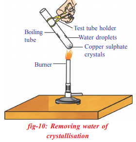 In the above activity copper sulphate crystals which seem to be dry contain the water of crystallization, when these crystals are heated, water present in crystals is evaporated and the salt turns white. When the crystals are moistened with water, the blue colour reappears. Water of crystallization is the fixed number of water molecules present in one formula unit of a salt. Five water molecules are present in one formula unit of copper sulphate. Chemical formula for hydrated copper sulphate is $$SUSO_{4}.5H_{2}O$$