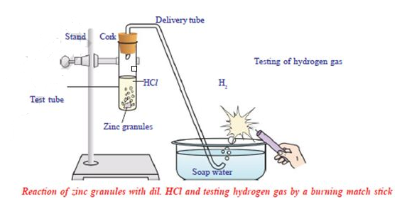Materials required: test tube, delivery tube, glass trough, candle, soap water, dil. HCl, and zinc granules, cork.