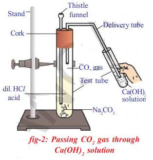 *Pass the gas produced in each case through lime water (calcium hydroxide solution) as shown in Fig 2 and record your observations.