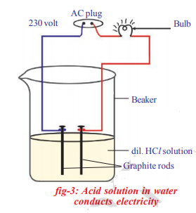 Connect free ends of the wire to 230 volts AC plug and complete the circuit by connecting a bulb to one of the wires. Now pour some dilute HCl in the beaker and switch on the current.
