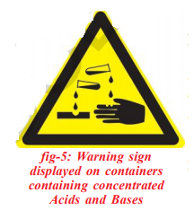 The process of dissolving an acid or a base in water is an exothermic process. Care must be taken while mixing concentrated nitric acid or sulphuric acid with water. The acid must always be added slowly to water with constant stirring. If water is added to a concentrated acid, the heat generated may cause the mixture to splash out and cause burns. The glass container may also break due to excessive local heating.
