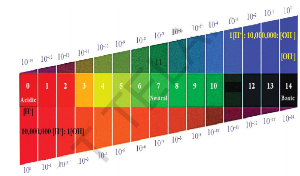 A scale for measuring hydrogen ion concentration in a solution is called pH scale. (The ‘p’ in pH stands for ‘Potenz’. In German Language ‘Potenz’ is power). pH value of a solution is simply a number which indicates the acidic or basic nature of a solution. The pH of neutral solutions is 7. Values less than 7 on the pH scale represent an acidic solution. As the pH value increases from 7 to 14, it represents a decrease in H3O$$H_{3}o^{+}$$+ ion concentration or an increase in $$H^{-}$$ion concentration in the solution. pH value of a solution above ‘7’ represents a basic solution. Observe the following figure.