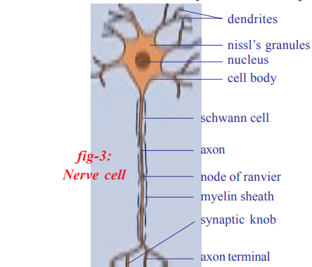 Each nerve cell consists of a cell body with a prominent nucleus. There are fine projections mainly of two types extending from the cell body of the nerve cell.