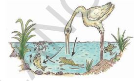 2. In a pond, we can see that eggs and larvae are eaten by fish and frogs. Fish and frogs are food for a crane.